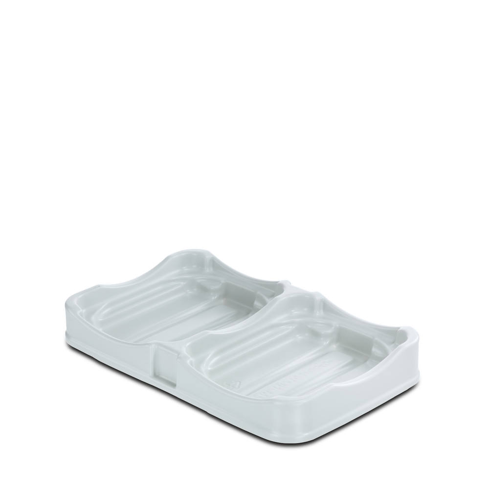Helle, rechteckige Seifenschale mit zwei Mulden zur Aufnahme von Seifenstücken. Kunststoff oder Keramik, schlichtes Design.