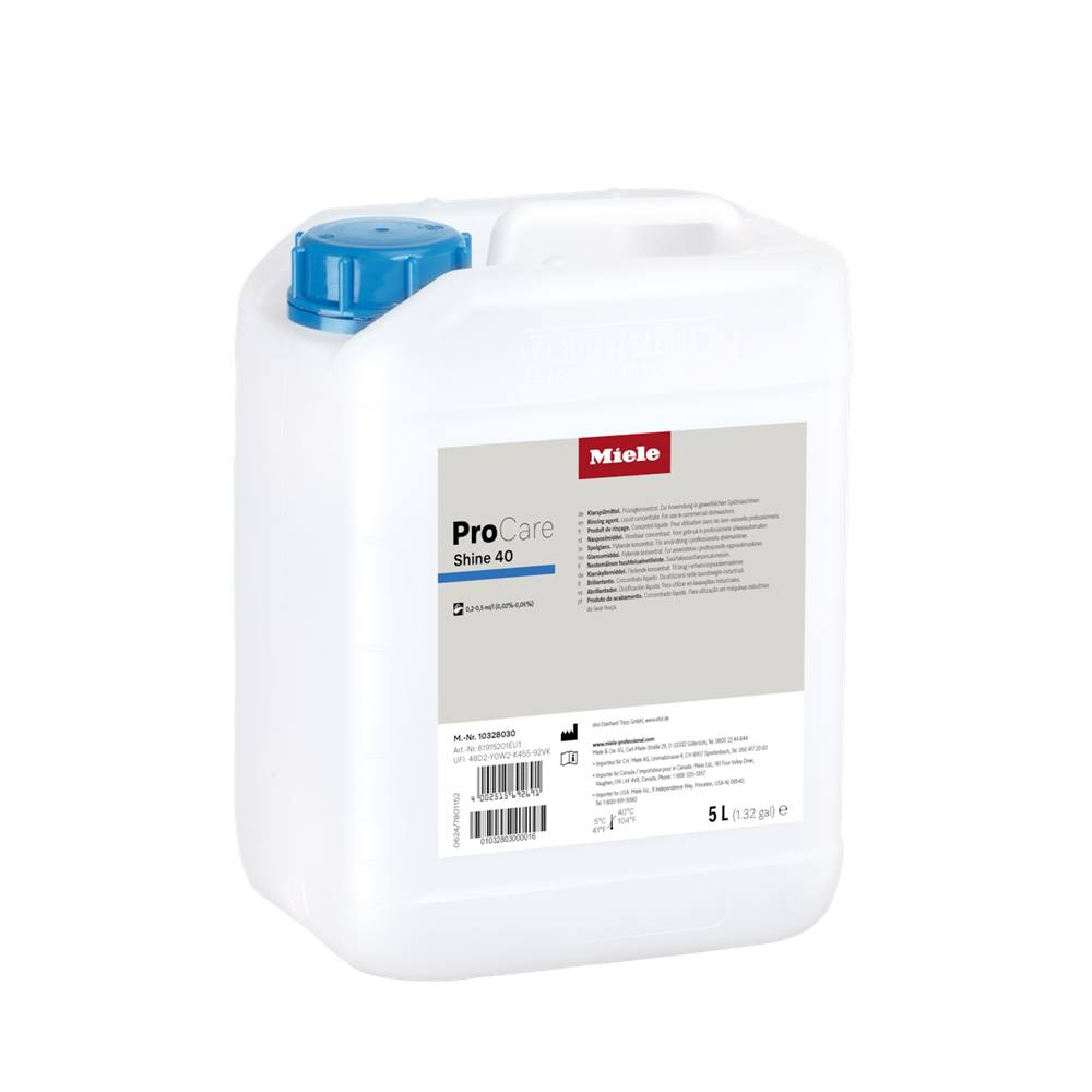 Weißer Kanister „Miele ProCare Shine 40“, Füllmenge 5 Liter, mit Etikett und Produktdetails.