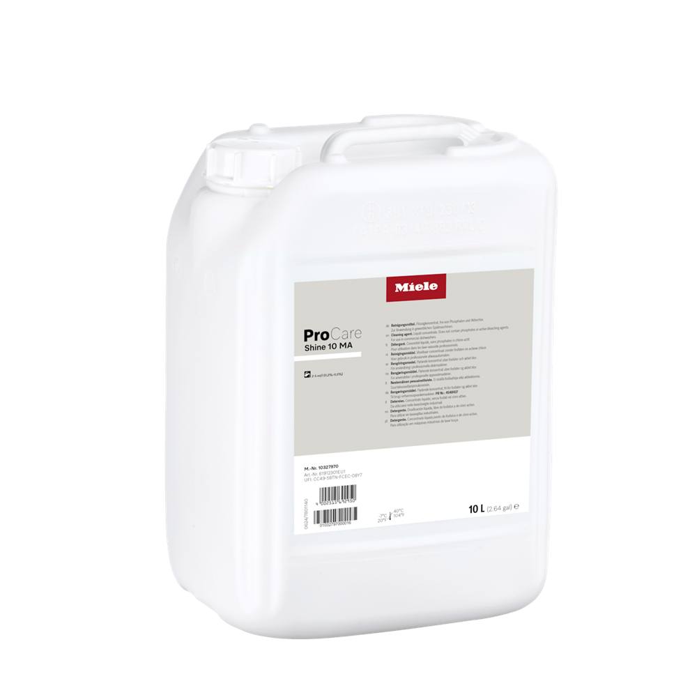 Weißer Kanister „ProCare Shine 10 MA“ von Miele, Füllmenge 10 Liter, mit Etikett und Produktinformationen.