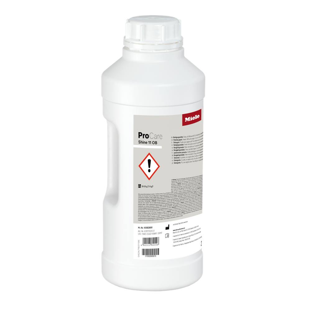 Weißer Kanister „ProCare Shine 11 OB“ von Miele mit Warnsymbolen und Produktinformationen in schwarzer Schrift.