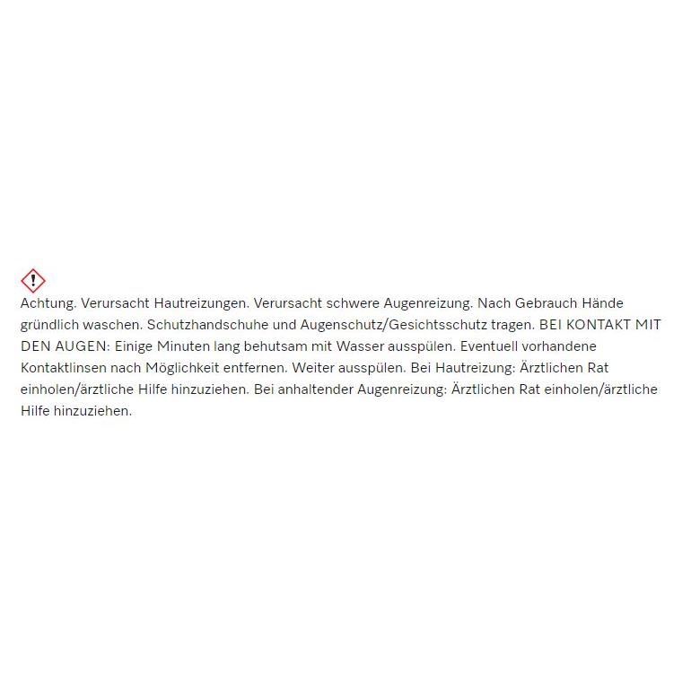 Warnhinweis: Verursacht Hautreizung und schwere Augenreizung. Schutzhandschuhe und -brille tragen. Bei Kontakt mit Augen: Ausspülen, ggf. Arzt aufsuchen.