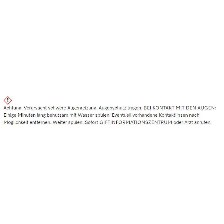 Warnschild mit rotem Rand. Text: „Verursacht schwere Augenreizung. Bei Kontakt mit den Augen: Einige Minuten spülen.“ Hinweis auf Giftnotruf.