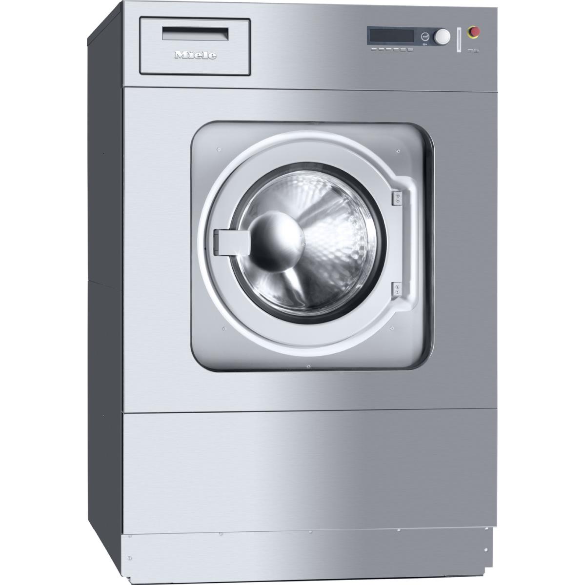 Silberne Waschmaschine von Miele mit runder Frontluke und Bedienfeld oben. Blick frontal, heller Hintergrund.