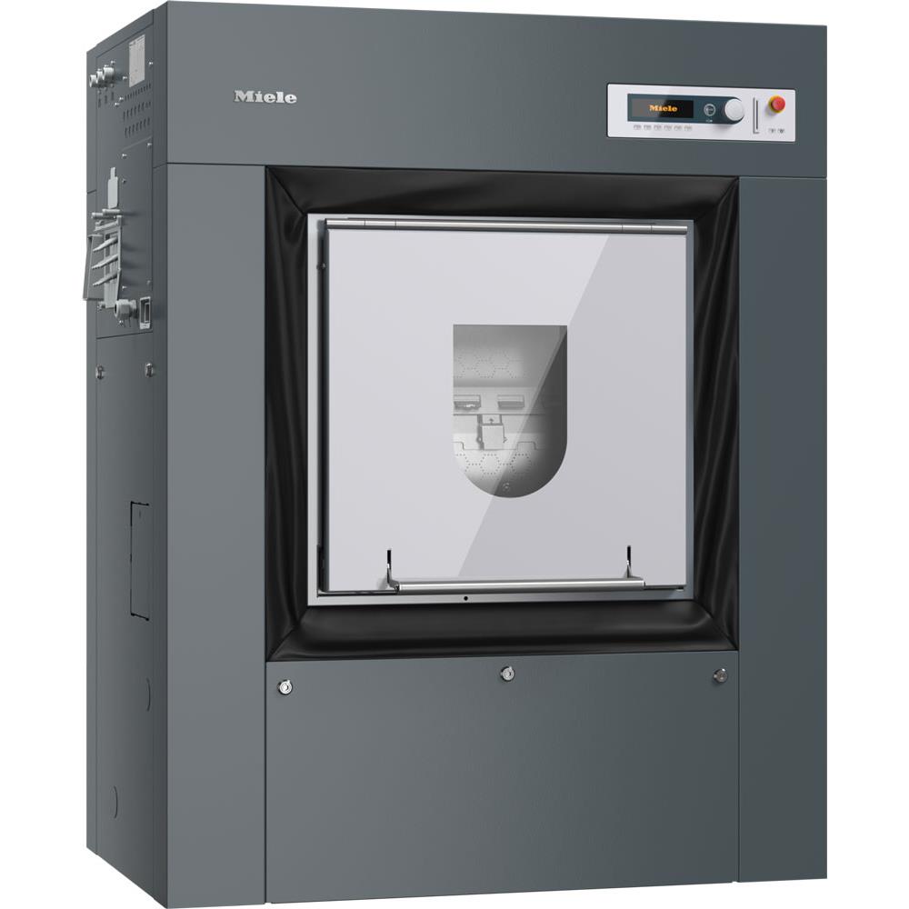 Industrieller Trockner von Miele, dunkelgrau, mit runder Glastür. Bedienfeld oben rechts. Für gewerbliche Wäschereien geeignet.