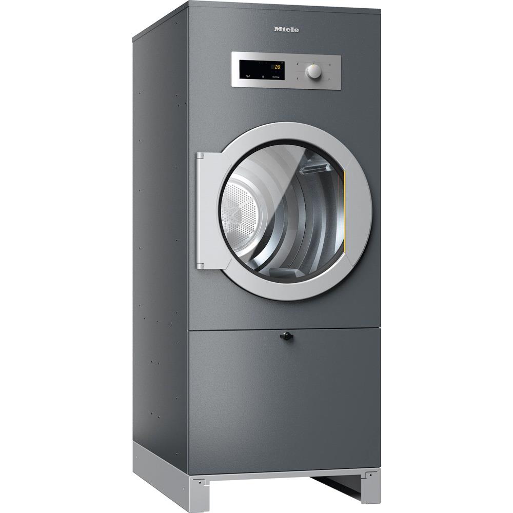 Grauer Miele-Trockner mit runder Luke und Bedienfeld. Das Gerät steht auf Füßen.